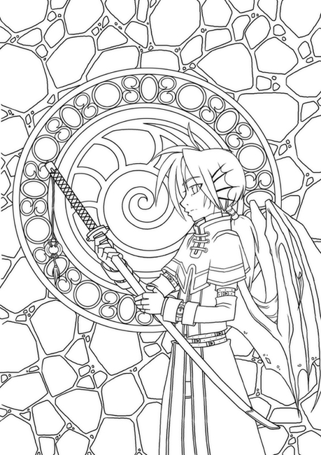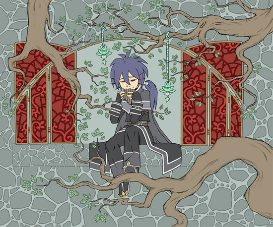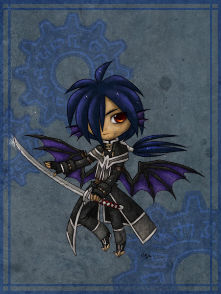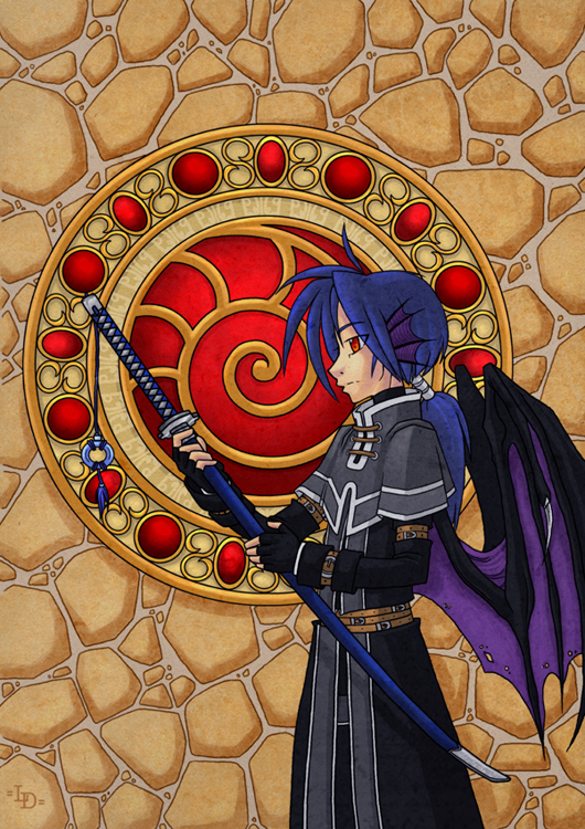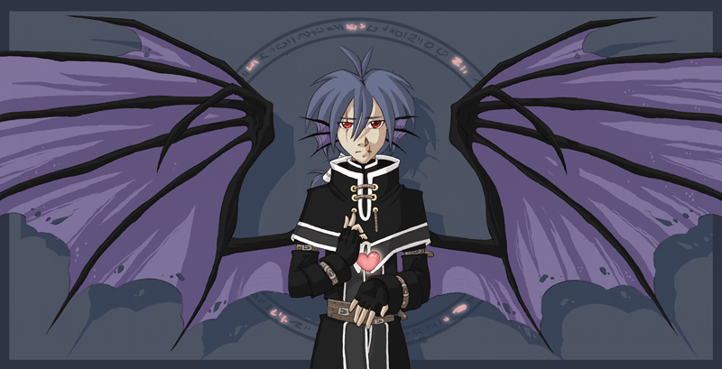 red-orange eyes, long and slim, black clothes, wears a pendant with his