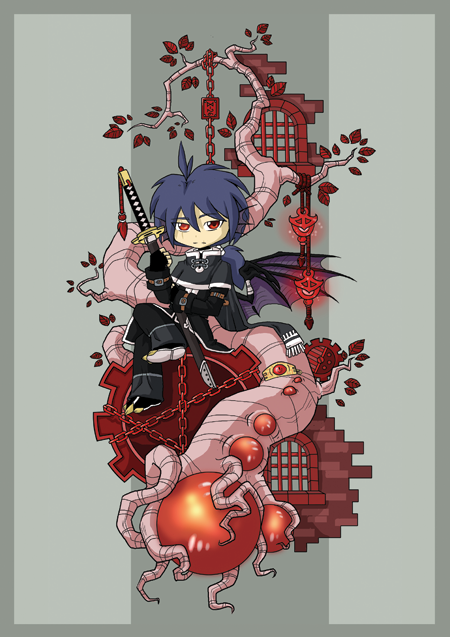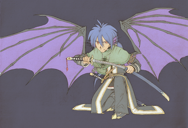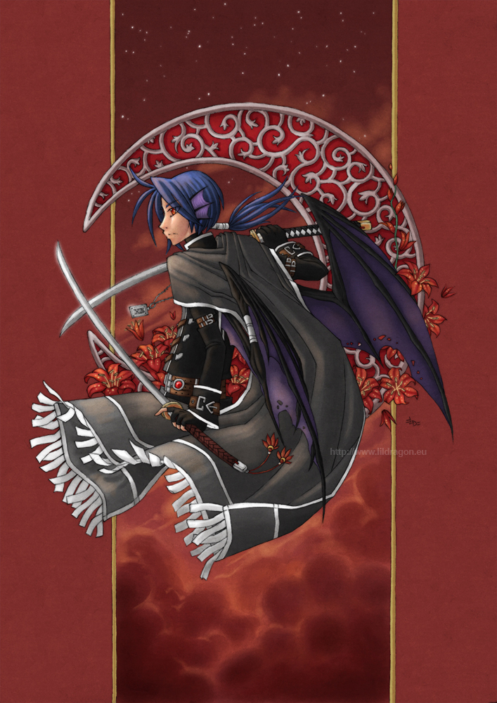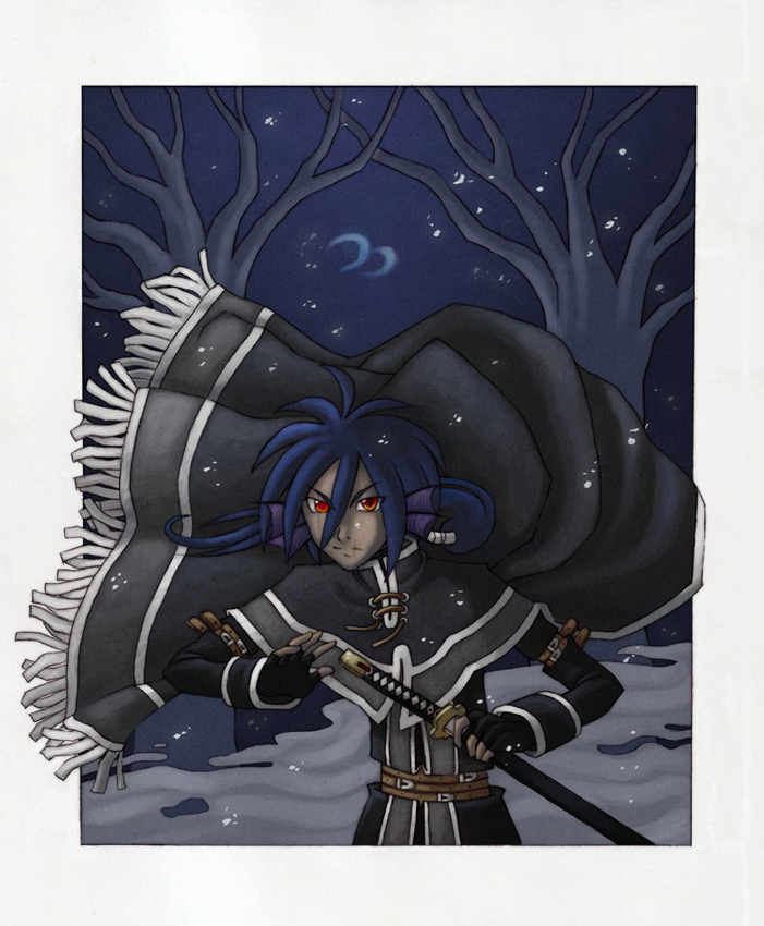 red-orange eyes, long and slim, black clothes, wears a pendant with his