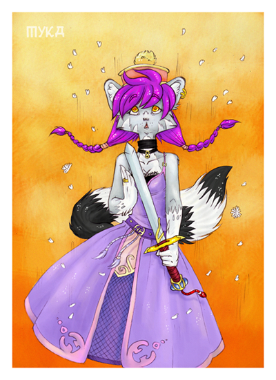 Myka of her character Myka. Pencils sketch coloured in Photoshop CS. June 2006.