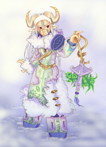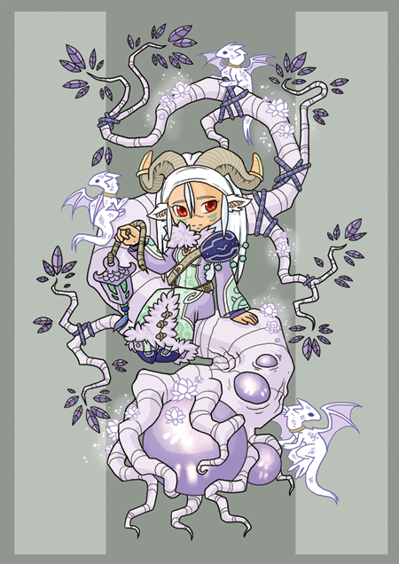 Physical appearance: White long hair, red eyes, pale skin, wears a long purple overcoat, carries a lantern